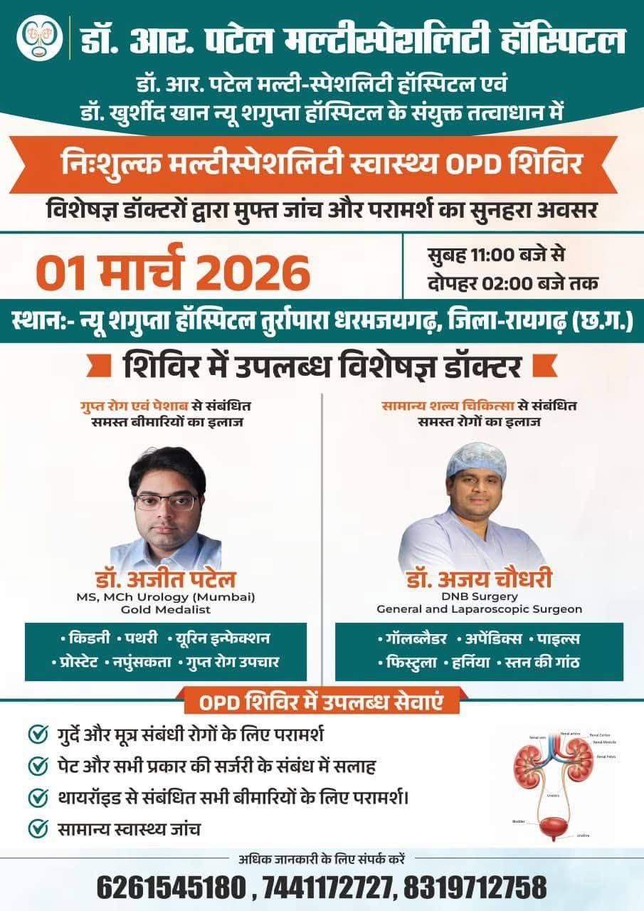 रायगढ़, छत्तीसगढ़By ACGN 7647981711, 9303948009 मुंबई से आए विशेषज्ञ डॉक्टर देंगे मुफ्त परामर्श, ग्रामीणों से अधिक से अधिक पहुंचने की...