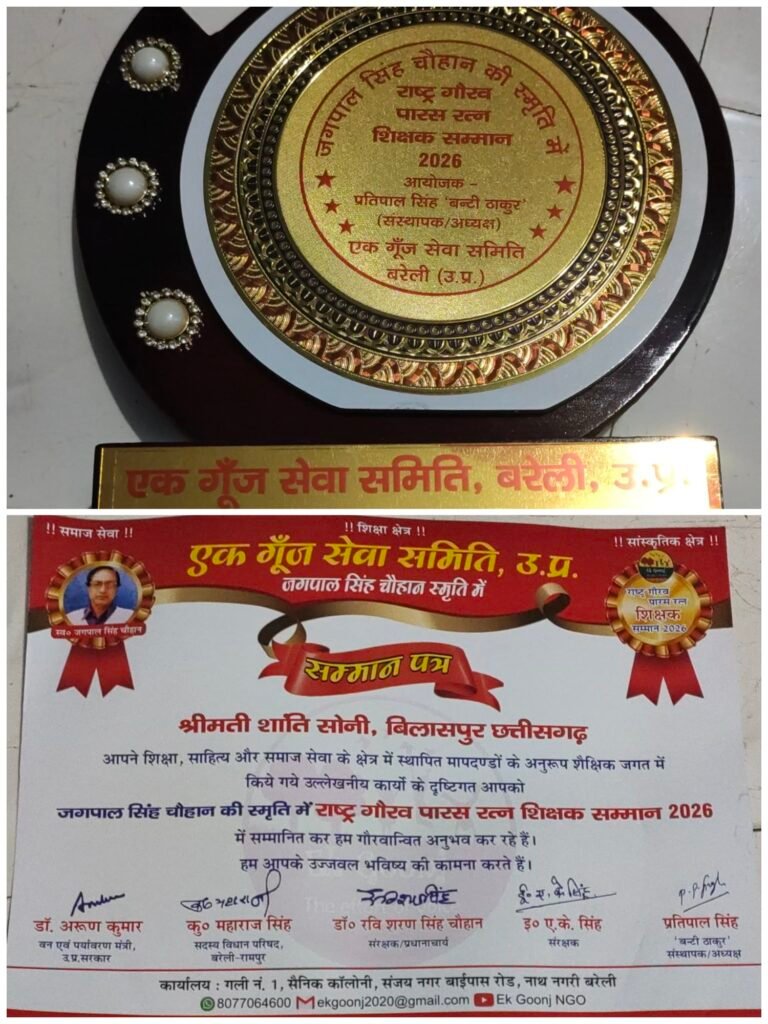 उत्तर प्रदेश बरेली में बिलासपुर की व्याख्याता शांति सोनी राष्ट्रीय गौरव पारस रत्न शिक्षक सम्मान 2026 से सम्मानित