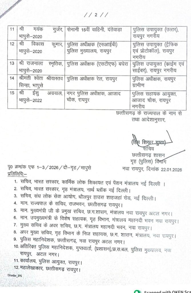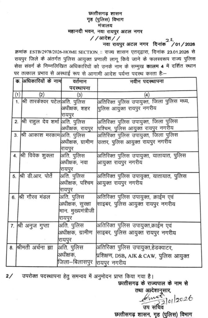 रायपुर कमिश्नरेट प्रणाली लागू, संजीव शुक्ला बने पहले पुलिस आयुक्त, कमिश्नरेट में तैनात अधिकारियों की पूरी सूची जारी