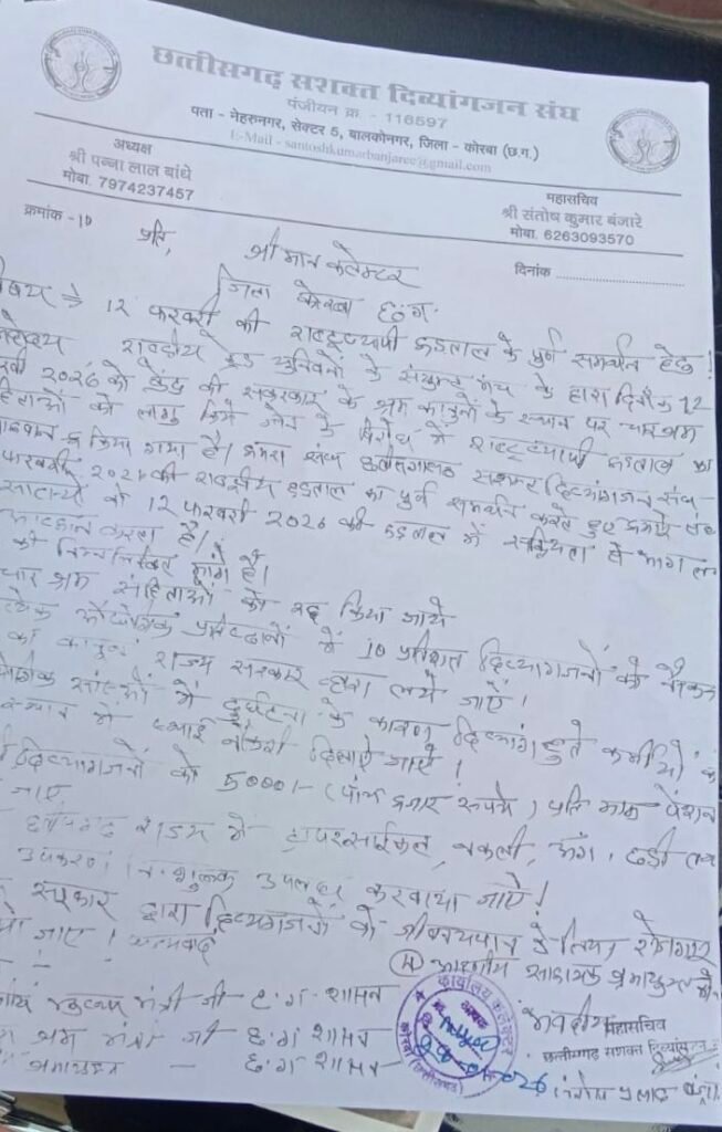 छत्तीसगढ़ सशक्त दिव्यांगजन संघ ने 28/01/2026 को ज्ञापन के माध्यम से सरकार के समक्ष दिव्यांग समाज से जुड़ी प्रमुख मांगें भी रखी हैं, जिनमें दिव्यांगजनों को ₹5000 प्रतिमाह सम्मानजनक पेंशन, सरकारी और निजी क्षेत्र में दिव्यांग आरक्षण का सख्ती से पालन, दिव्यांग युवाओं के लिए रोजगार व कौशल प्रशिक्षण की व्यवस्था, व्हीलचेयर, ट्राई-साइकिल, श्रवण यंत्र सहित आवश्यक सहायक उपकरणों की निःशुल्क उपलब्धता, लंबित पेंशन और सहायता राशि का तत्काल भुगतान तथा दिव्यांग कल्याण से जुड़ी योजनाओं का प्रभावी क्रियान्वयन शामिल है।