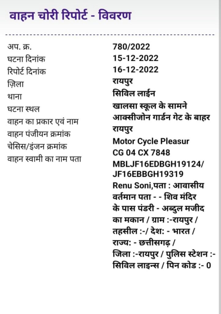 इसके अलावा थाना तारबहार बिलासपुर में भी सशक्त मोबाइल एप के माध्यम से लावारिस खड़ी मोटर साइकिल क्रमांक सीजी 10 ईडी 6156 की जांच की गई, जिसमें यह सामने आया कि उक्त वाहन के चोरी होने का प्रकरण थाना चकरभाठा जिला बिलासपुर में अपराध क्रमांक 435/2023 के अंतर्गत दर्ज है।