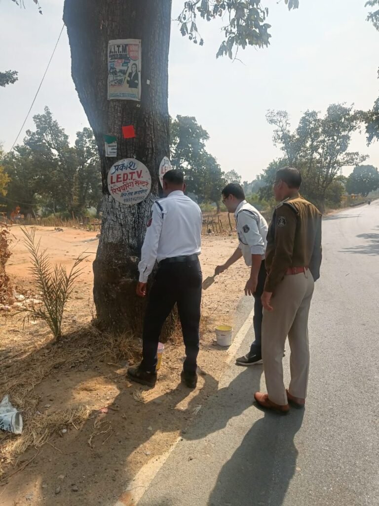 सड़क सुरक्षा माह के समापन अवसर पर कोरबा कलेक्टर कुणाल देवदत्त एवं पुलिस अधीक्षक सिद्धार्थ तिवारी की गरिमामयी उपस्थिति में करतला से हाटी रोड मार्ग पर विशेष सुरक्षा अभियान चलाया गया। इस दौरान सड़क किनारे स्थित पेड़ों पर कलर एवं रेडियम पट्टी लगाए जाने का कार्य किया गया।