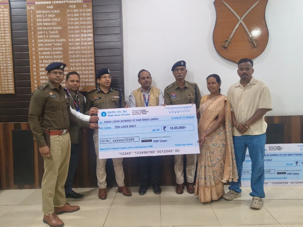 रायगढ़, 3 फरवरी। ड्यूटी के दौरान आकस्मिक निधन होने पर जिले में पदस्थ स्वर्गीय प्रधान आरक्षक दिलीप ठाकुर की पत्नी सरस्वती सिंह ठाकुर और जीआरपी थाने में पदस्थ स्वर्गीय राम सिंह लकड़ा की पत्नी किरण लकड़ा को पुलिस सैलरी पैकेज के अंतर्गत 10–10 लाख रुपये की बीमा राशि का चेक प्रदान किया गया। यह चेक वरिष्ठ पुलिस अधीक्षक शशि मोहन सिंह और एसबीआई शाखा पुसौर के प्रबंधक द्वारा सौंपा गया। इस दौरान शोकसंतप्त परिजनों के प्रति संवेदना व्यक्त करते हुए उन्हें हरसंभव सहयोग का भरोसा दिलाया गया।
