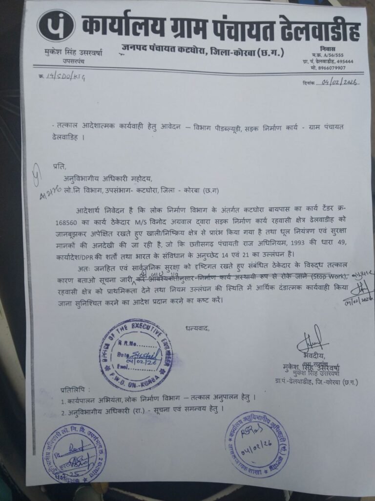 ग्राम पंचायत ढेलवाडीह द्वारा लोक निर्माण विभाग के अनुविभागीय अधिकारी को सौंपे गए लिखित आवेदन में कहा गया है कि ठेकेदार ने सड़क निर्माण की शुरुआत ऐसे हिस्से से की है जहां आबादी नहीं है, जबकि गांव के मुख्य रहवासी क्षेत्र को पूरी तरह नजरअंदाज कर दिया गया। इससे साफ संकेत मिलता है कि निर्माण कार्य की योजना और निगरानी में लोक निर्माण विभाग की भूमिका भी सवालों के घेरे में है। पंचायत का कहना है कि यदि विभाग समय रहते हस्तक्षेप करता तो स्थिति यहां तक नहीं पहुंचती।