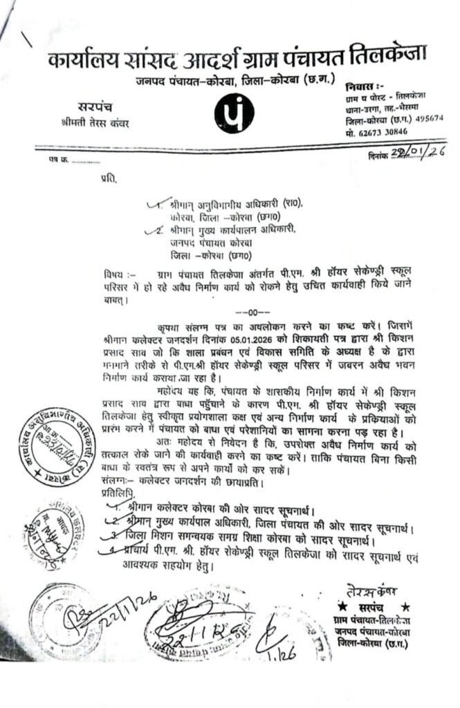 पत्रों में यह भी उल्लेख है कि निर्माण के लिए न तो पीएम श्री हायर सेकेंडरी स्कूल तिलकेजा को विधिवत कार्य एजेंसी बनाया गया,