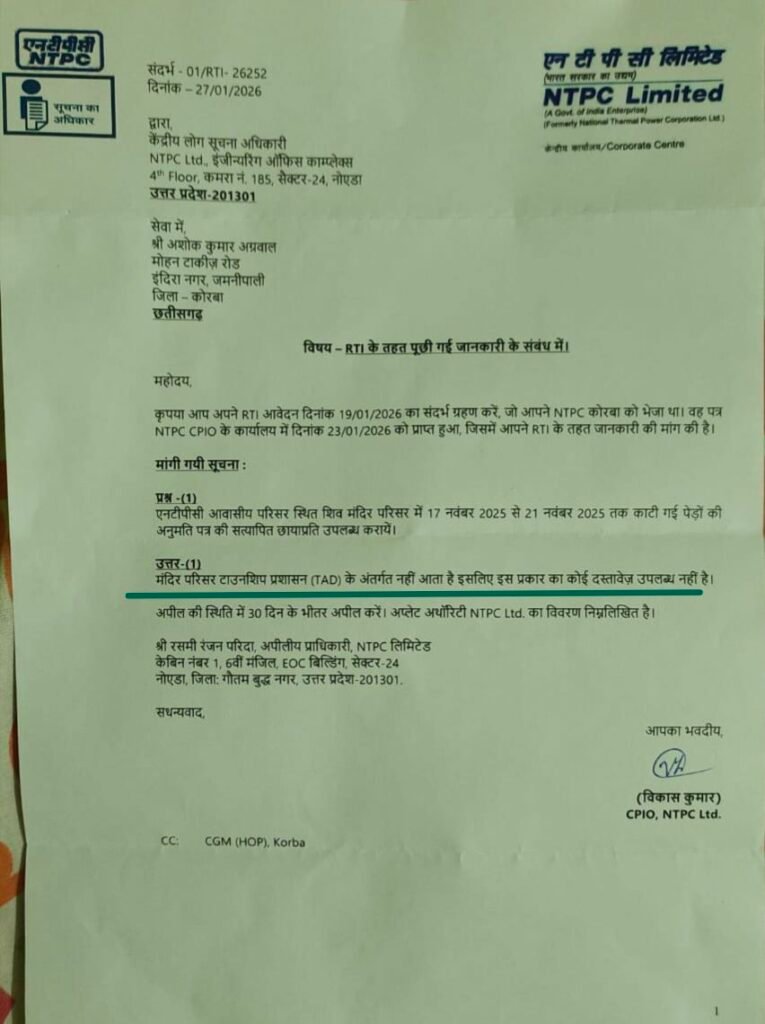 कोरबा ACGN:- कोरबा स्थित NTPC Limited एक बार फिर सूचना के अधिकार के मामले को लेकर चर्चा में आ गया है। स्थानीय निवासी द्वारा आवासीय परिसर स्थित मंदिर क्षेत्र में कथित पेड़ कटाई को लेकर मांगी गई जानकारी के जवाब में कंपनी प्रबंधन ने पत्र जारी कर कहा है कि संबंधित परिसर टाउनशिप प्रशासन टीएडी के अंतर्गत नहीं आता और इस संबंध में कोई दस्तावेज उपलब्ध नहीं है।
