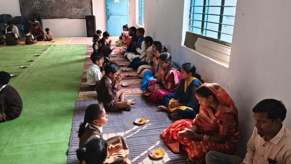 कार्यक्रम की शुरुआत मां सरस्वती, ओम् तथा भारत माता के तैलचित्र पर दीप प्रज्वलन के साथ हुई। कक्षा अरुण उदय से पंचम तक के भैया-बहनों ने अपने अभिभावकों के साथ इस विशेष आयोजन में भाग लिया। वैदिक मंत्रोच्चार के बीच विद्यार्थियों ने अपने माता-पिता का विधिवत पूजन, तिलक और आरती कर आशीर्वाद लिया तथा उनका मुंह मीठा कराया। इस भावुक क्षण में कई अभिभावकों की आंखें नम हो गईं और परिसर में अपनत्व और संस्कार का वातावरण दिखाई दिया।