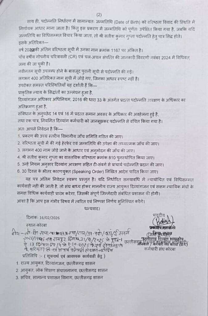 कोरबा ACGN:- छत्तीसगढ़ दिव्यांग शासकीय अधिकारी-कर्मचारी संघ, जिला कोरबा ने कलेक्टर को दो अलग-अलग विषयों पर विस्तृत ज्ञापन सौंपकर उच्च स्तरीय जांच एवं सुधारात्मक आदेश जारी करने की मांग की है। संघ ने टी-संवर्ग व्याख्याता से प्राचार्य पदोन्नति प्रक्रिया में कथित अनियमितता, वरिष्ठता क्रम में हेरफेर, दिव्यांग आरक्षण की अवहेलना तथा जन्मतिथि की उपेक्षा जैसे गंभीर आरोप लगाए हैं। साथ ही आधार-फेस आधारित बायोमेट्रिक उपस्थिति प्रणाली में दिव्यांग कर्मचारियों को युक्तियुक्त छूट प्रदान करने की भी मांग की है।