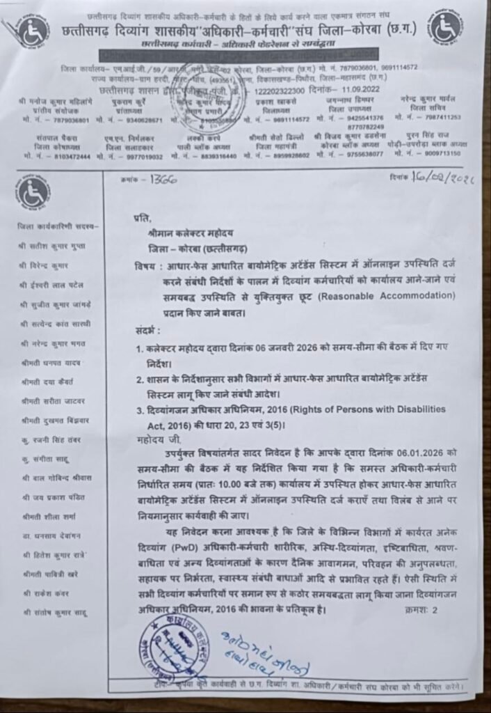 इसी क्रम में संघ ने आधार-फेस आधारित बायोमेट्रिक अटेंडेंस सिस्टम के संबंध में भी ज्ञापन सौंपा है। ज्ञापन में कहा गया है कि 6 जनवरी 2026 की समय-सीमा बैठक में प्रातः 10 बजे तक अनिवार्य उपस्थिति के निर्देश दिए गए हैं, किंतु जिले के विभिन्न विभागों में कार्यरत अनेक दिव्यांग कर्मचारी शारीरिक, दृष्टि, श्रवण एवं अन्य दिव्यांगताओं के कारण नियमित आवागमन में कठिनाइयों का सामना करते हैं। परिवहन की अनुपलब्धता, सहायक पर निर्भरता और स्वास्थ्य संबंधी बाधाएं उनके लिए अतिरिक्त चुनौती बनती हैं।