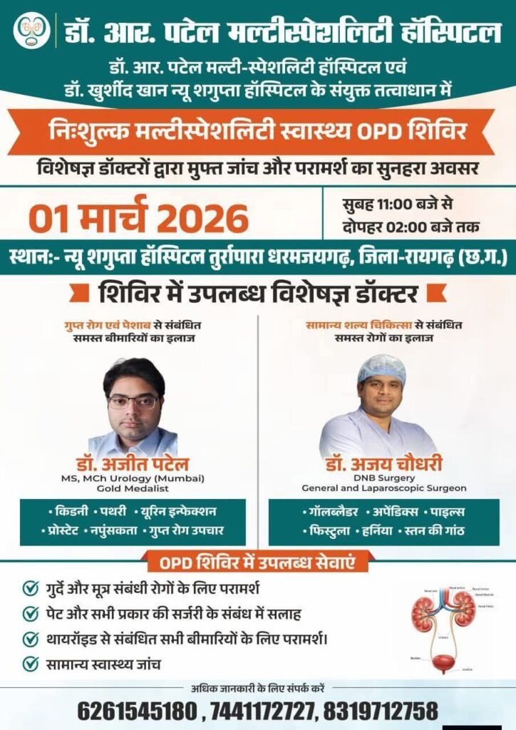 रायगढ़ ACGN:- धरमजयगढ़ क्षेत्र के ग्रामीणों के लिए राहत भरी खबर है। आगामी 1 मार्च 2026, रविवार को न्यू शगुफ्ता हॉस्पिटल, तुर्रापारा धरमजयगढ़ में विशाल निःशुल्क मल्टीस्पेशलिटी स्वास्थ्य OPD शिविर का आयोजन किया जा रहा है। यह शिविर डॉ. आर. पटेल मल्टीस्पेशलिटी हॉस्पिटल एवं न्यू शगुफ्ता हॉस्पिटल के संयुक्त तत्वावधान में आयोजित होगा। शिविर सुबह 11 बजे से दोपहर 2 बजे तक चलेगा, जिसमें विशेषज्ञ डॉक्टरों द्वारा मरीजों की निःशुल्क जांच और परामर्श दिया जाएगा।