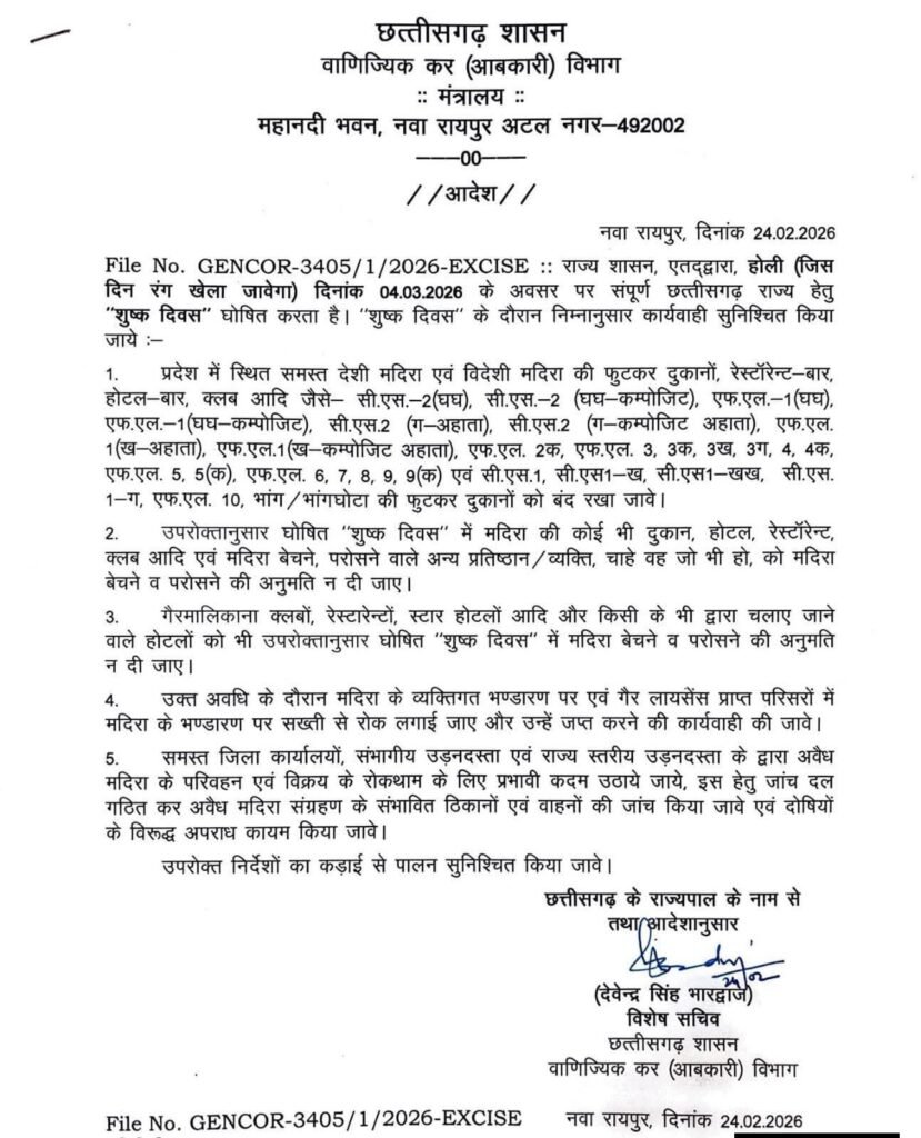 रायपुर ACGN:- छत्तीसगढ़ सरकार ने होली पर्व के अवसर पर 4 मार्च 2026 को पूरे प्रदेश में ड्राई डे घोषित किया है। आबकारी विभाग द्वारा जारी आदेश के अनुसार इस दिन राज्यभर में शराब की बिक्री पूरी तरह प्रतिबंधित रहेगी। सभी देशी और विदेशी मदिरा दुकानें, बार, क्लब और होटल-बार बंद रहेंगे।