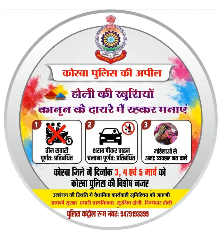 कोरबा पुलिस ने आम नागरिकों से अपील की है कि होली शांतिपूर्ण और कानून के दायरे में रहकर मनाएं।