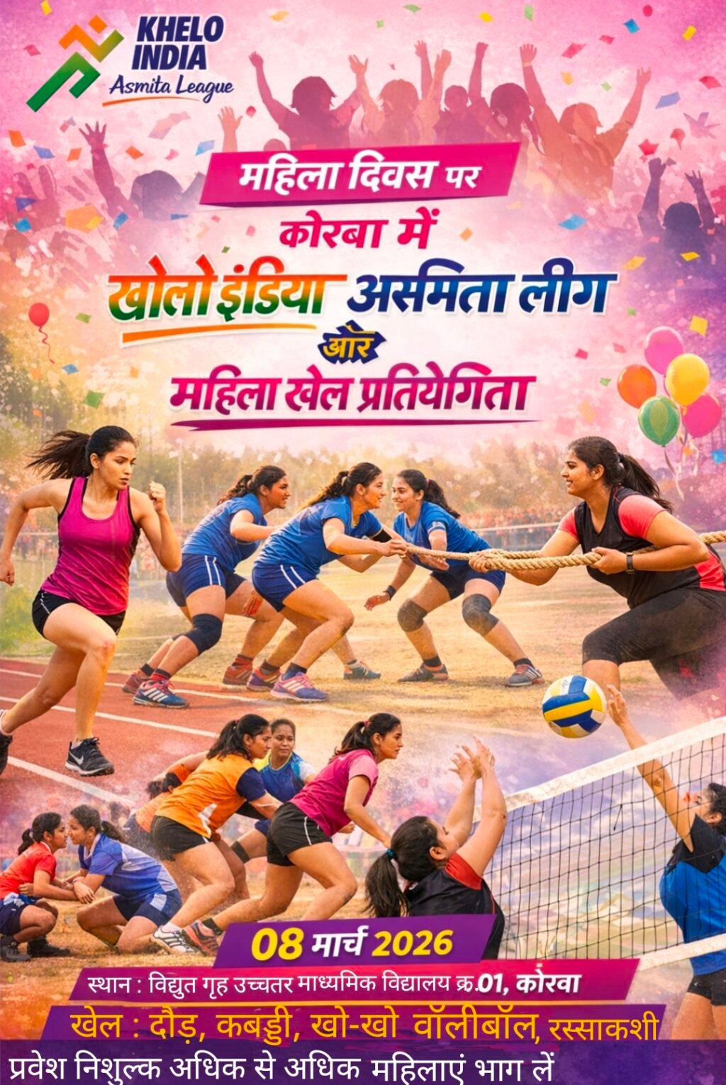 कोरबा ACGN:- अंतर्राष्ट्रीय महिला दिवस के अवसर पर 8 मार्च 2026 को कोरबा जिले में खेलो इंडिया अस्मिता लीग के तहत विभिन्न खेल प्रतियोगिताओं का आयोजन किया जाएगा। संचालनालय खेल एवं युवा कल्याण विभाग छत्तीसगढ़ के निर्देशानुसार जिला खेल एवं युवा कल्याण विभाग कोरबा द्वारा यह आयोजन विद्युत गृह उच्चतर माध्यमिक विद्यालय क्रमांक 01 कोरबा में किया जा रहा है।
