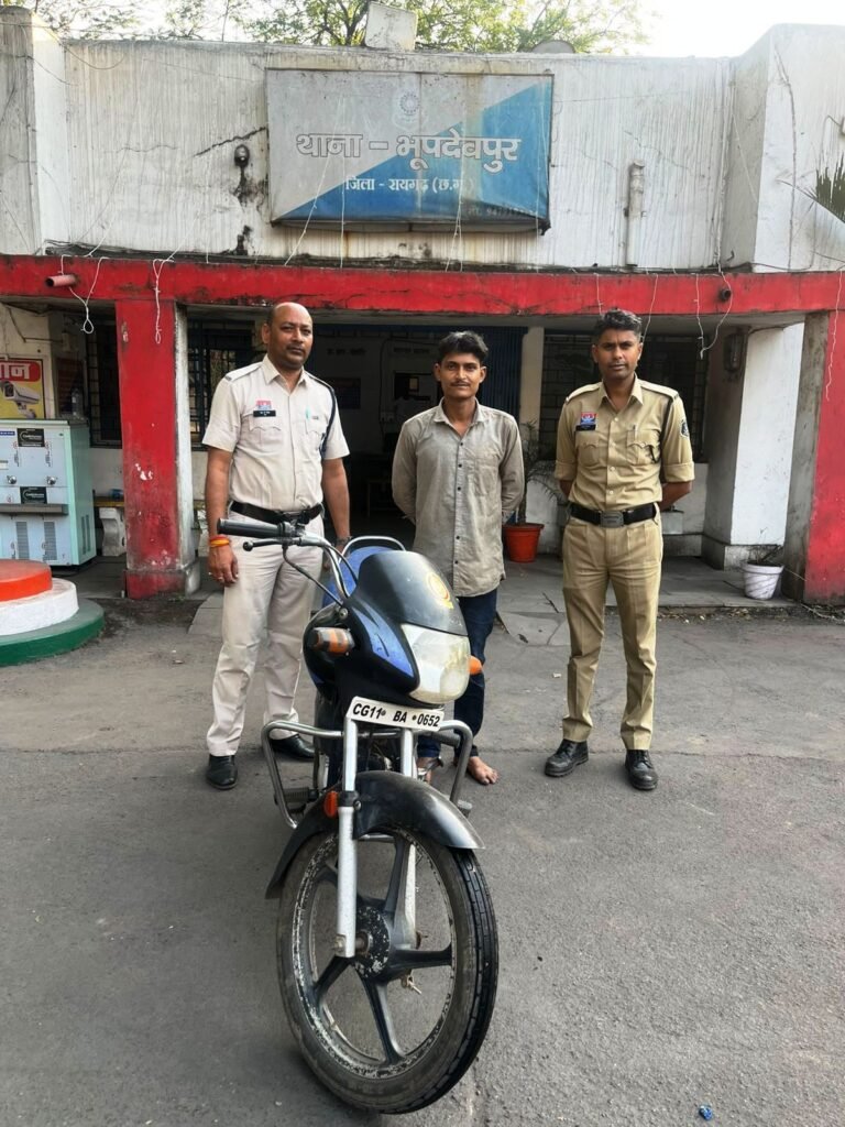रिपोर्ट पर थाना भूपदेवपुर में अज्ञात आरोपी के विरुद्ध अपराध क्रमांक 31/2026 धारा 303(2) भारतीय न्याय संहिता के तहत मामला दर्ज कर विवेचना शुरू की गई। जांच के दौरान पुलिस ने प्रार्थी और गवाहों से पूछताछ करते हुए मुखबिर तंत्र को सक्रिय किया। इसी बीच सूचना मिली कि चोरी की मोटरसाइकिल ग्राम कुर्रूभाठा क्षेत्र में देखी गई है।