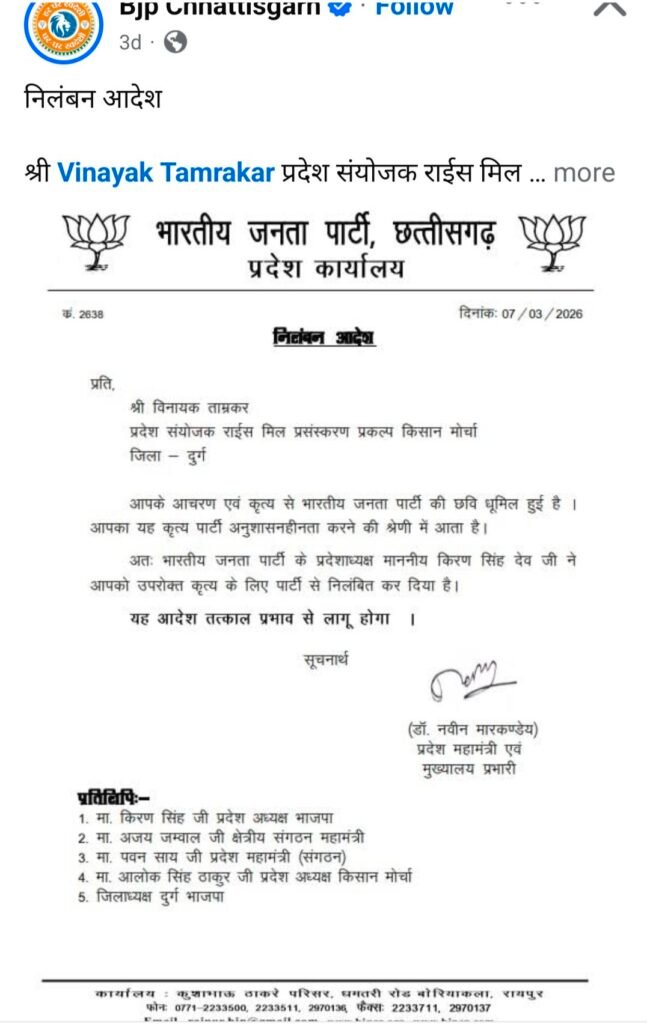 वहीं इस पूरे घटनाक्रम के बाद भारतीय जनता पार्टी ने भी संगठनात्मक स्तर पर कार्रवाई करते हुए विनायक ताम्रकार को तत्काल प्रभाव से पार्टी से निलंबित कर दिया। प्रदेश कार्यालय से जारी आदेश में कहा गया कि उनके आचरण और कृत्य से पार्टी की छवि धूमिल हुई है, जो अनुशासनहीनता की श्रेणी में आता है।