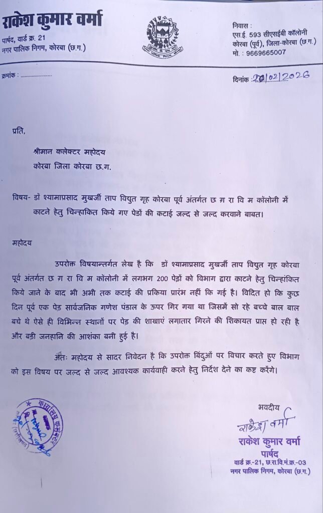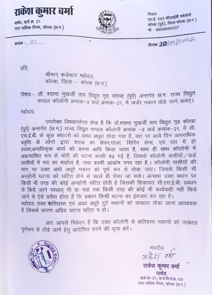 कोरबा ACGN:- कोरबा जिले के डॉ. श्यामा प्रसाद मुखर्जी ताप विद्युत गृह अंतर्गत छत्तीसगढ़ राज्य विद्युत मंडल कॉलोनी वार्ड क्रमांक-21, कोरबा पूर्व में कर्मचारियों और उनके परिवार जनों के सामने लंबे समय से कई गंभीर समस्याएं बनी हुई हैं। स्थानीय पार्षद राकेश शर्मा ने इन समस्याओं को गंभीर मानते हुए अपने लिखित शिकायत कलेक्टर कार्यालय में दर्ज कराई, जिसमें कॉलोनीवासियों और कर्मचारियों की बढ़ती परेशानियों और सुरक्षा संकट को विस्तार से उजागर किया गया।