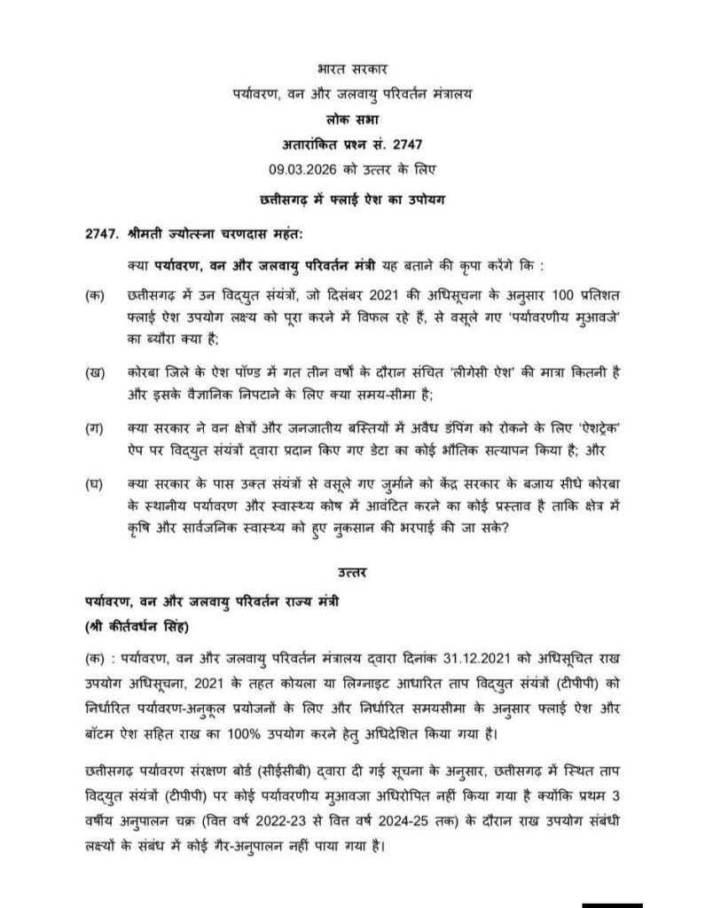 कोरबा के थर्मल पॉवर प्लांट और औद्योगिक प्रदूषण को लेकर सांसद ने सरकार से मांगे ठोस जवाब, स्थायी समाधान की उठाई मांग