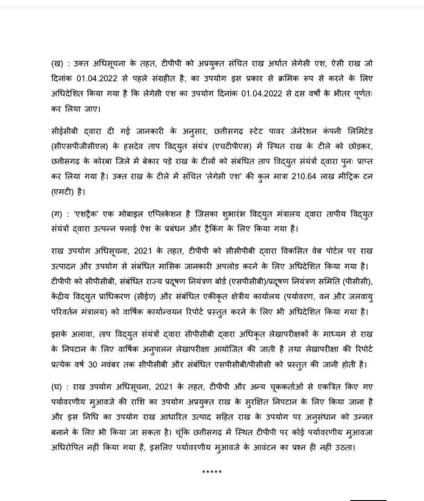 मंत्री ने बताया कि थर्मल पॉवर प्लांटों को अप्रयुक्त संचित राख, अर्थात लेगेसी ऐश, का क्रमिक रूप से उपयोग करने के लिए निर्देशित किया गया है। 1 अप्रैल 2022 से अगले 10 वर्षों में इसका पूरी तरह उपयोग सुनिश्चित करने का लक्ष्य रखा गया है। उन्होंने यह भी बताया कि हसदेव ताप विद्युत संयंत्र स्थित ऐश पॉन्ड को छोड़कर कोरबा जिले में अन्य बेमतलब के ऐश पॉन्ड को विद्युत कंपनी द्वारा फिर से प्राप्त किया गया है। वर्तमान में वहां संचित लेगेसी ऐश की कुल मात्रा 210.64 लाख मीट्रिक टन है।