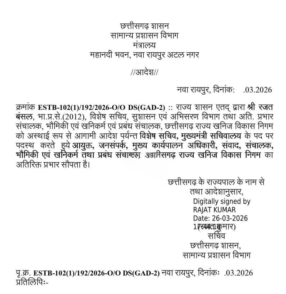 इसके अलावा रजत बंसल को संचालक भौमिकी एवं खनिकर्म तथा प्रबंध संचालक छत्तीसगढ़ राज्य खनिज विकास निगम का अतिरिक्त प्रभार भी सौंपा गया है। इन विभागों के माध्यम से प्रदेश के खनिज संसाधनों के प्रबंधन और राजस्व से जुड़े महत्वपूर्ण कार्यों की जिम्मेदारी भी उनके पास रहेगी।