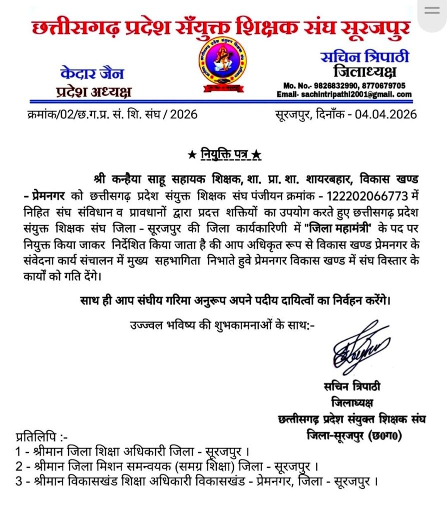 सूरजपुर जिले में संगठन के विस्तार और मजबूती की दिशा में एक महत्वपूर्ण कदम उठाते हुए छत्तीसगढ़ प्रदेश संयुक्त शिक्षक संघ ने विकासखंड प्रेमनगर के सक्रिय सदस्य कन्हैया साहू को जिला कार्यकारिणी में शामिल कर जिला महामंत्री की महत्वपूर्ण जिम्मेदारी सौंपी है।