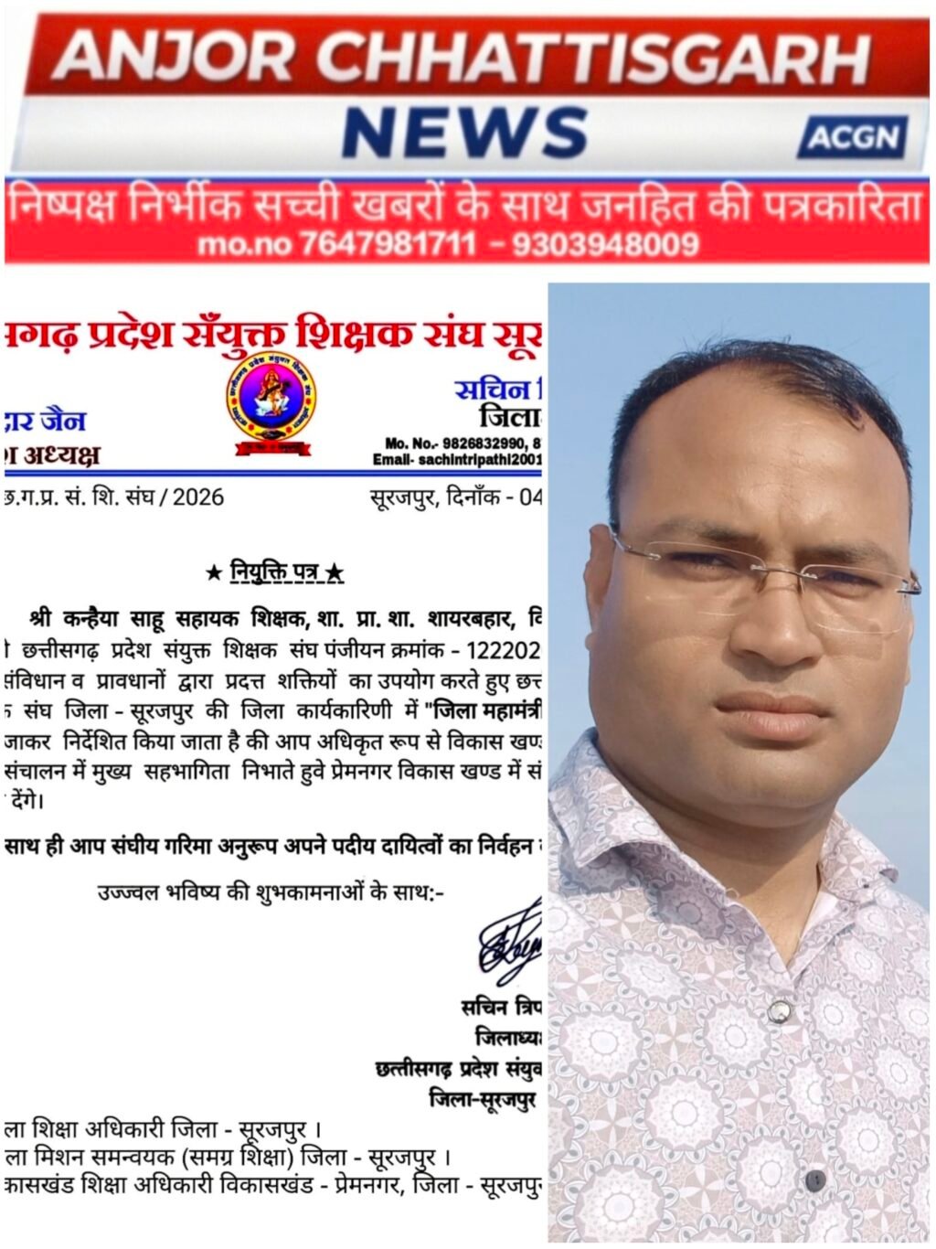 कन्हैया साहू को संयुक्त शिक्षक संघ में मिली बड़ी जिम्मेदारी