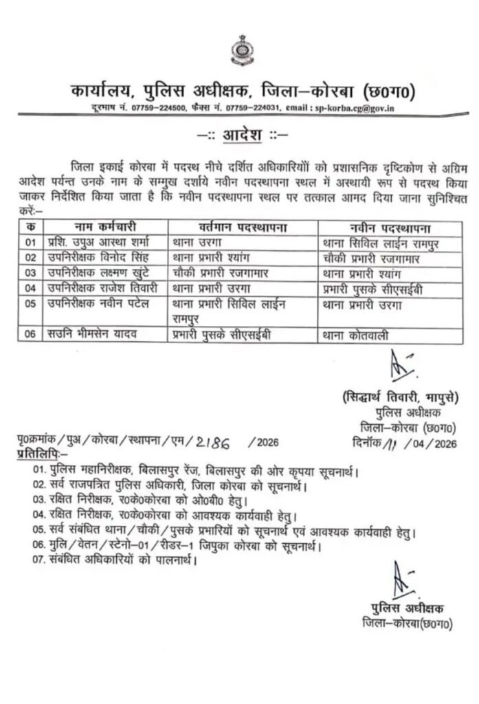 कोरबा। जिला पुलिस बल में प्रशासनिक व्यवस्था को सुदृढ़ बनाने के उद्देश्य से पुलिस अधीक्षक सिद्धार्थ तिवारी द्वारा छह पुलिस अधिकारियों का स्थानांतरण आदेश जारी किया गया है। जारी आदेश के अनुसार अधिकारियों को उनके वर्तमान पदस्थापना स्थल से स्थानांतरित कर नए स्थानों पर अस्थायी रूप से पदस्थ किया गया है तथा उन्हें तत्काल कार्यभार ग्रहण करने के निर्देश दिए गए हैं।