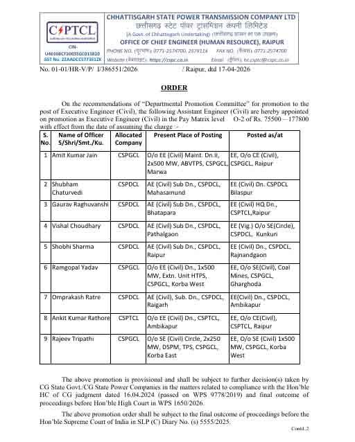 छत्तीसगढ़ की सरकारी विद्युत व्यवस्था से जुड़ी प्रमुख कंपनी छत्तीसगढ़ राज्य विद्युत वितरण कंपनी मर्यादित में इंजीनियरों की पदोन्नति को लेकर विभागीय हलकों में चर्चा तेज हो गई है। प्राप्त जानकारी के अनुसार 17 अप्रैल 2026 को सहायक अभियंता (एई) से कार्यपालन अभियंता (ईई) पद के लिए जारी की गई पदोन्नति सूची के बाद इंजीनियरों के बीच मेरिट, वरिष्ठता और प्रशासनिक प्रक्रिया को लेकर कई प्रकार के सवाल उठाए जा रहे हैं।