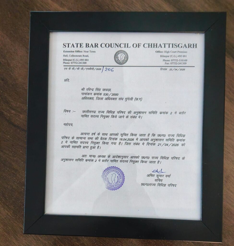 गौरतलब है कि रविन्द्र सिंह छाबड़ा मुंगेली के प्रतिष्ठित अधिवक्ता हैं और उनकी इस नियुक्ति से विधिक क्षेत्र में अनुशासन और पारदर्शिता को नई मजबूती मिलने की उम्मीद जताई जा रही है। समारोह में बड़ी संख्या में अधिवक्ताओं और शुभचिंतकों की उपस्थिति ने इस उपलब्धि को और गरिमामय बना दिया।
