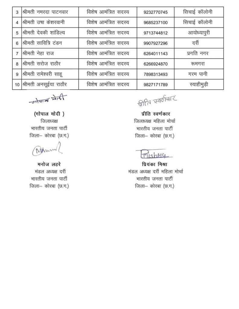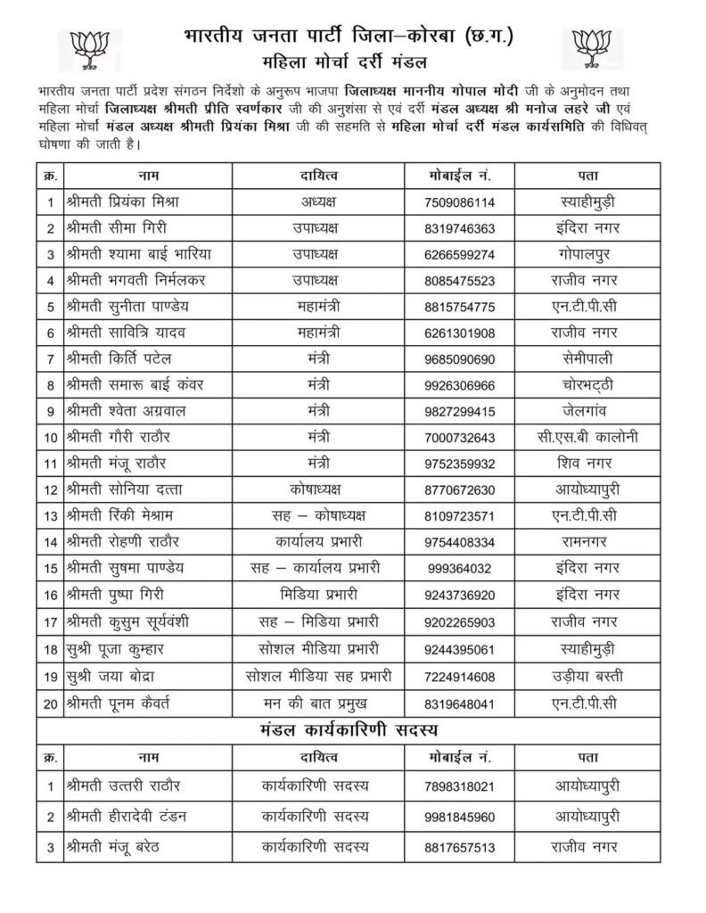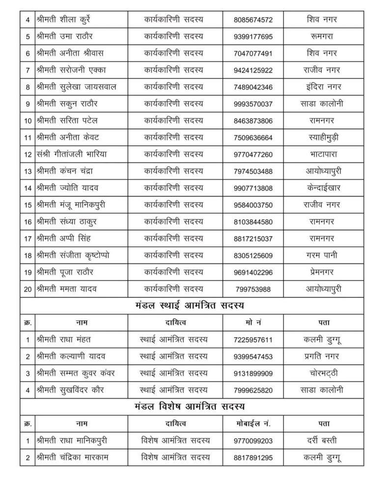 नई कार्यकारिणी में संगठनात्मक संतुलन और सक्रियता को ध्यान में रखते हुए विभिन्न पदों पर जिम्मेदारियां सौंपी गई हैं। सीमा गिरी को उपाध्यक्ष, सावित्री यादव को महामंत्री, सोनिया दत्ता को कोषाध्यक्ष, गौरी राठौर एवं श्वेता अग्रवाल को मंत्री बनाया गया है। वहीं पुष्पा गिरी को मीडिया प्रभारी, पूनम केवर्त को “मन की बात” प्रमुख, सुषमा पांडे को सहकार्यालय प्रभारी तथा अंजु मानिकपुरी एवं ममता यादव को कार्यकारिणी सदस्य की जिम्मेदारी दी गई है।