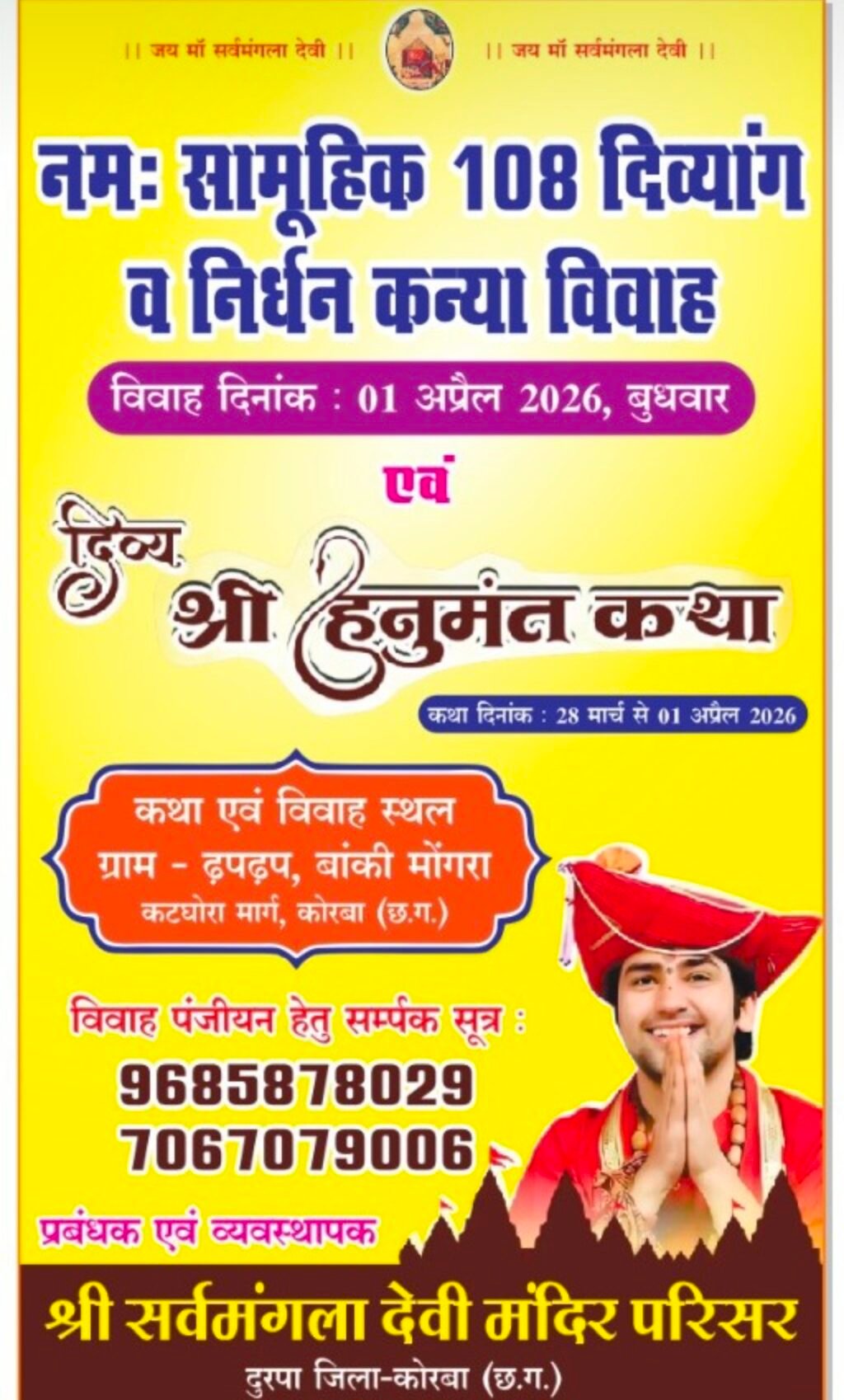 कोरबा, छत्तीसगढ़By ACGN 7647981711, 9303948009 27 मार्च को भव्य कलश यात्रा, 28 मार्च से श्री हनुमंत कथा; 01 अप्रैल को...